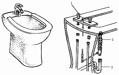 В биде подводится как горячая, так и холодная вода, температура которой регулируется смесителем. Устанавливается биде в непосредственной близости от унитаза. Биде просты как в конструкции, так и в установке (рис. 15).