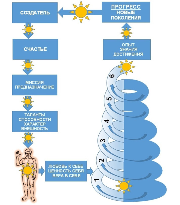 И используя в процессе своей жизни всё то, что мы получили свыше, то, что нам передали наши родители, и то, что мы развили в себе самостоятельно, ЛЮБЯ И ЦЕНЯ СЕБЯ, ВЕРЯ В СВОИ СИЛЫ, мы растём, развиваемся, совершенствуемся, достигаем своих целей и таким образом ВЗБИРАЕМСЯ ПО СПИРАЛИ СВОЕЙ ЖИЗНИ ВВЕРХ, ПОДНИМАЯСЬ ОТ НИЖНЕГО УРОВНЯ К БОЛЕЕ ВЫСОКОМУ.