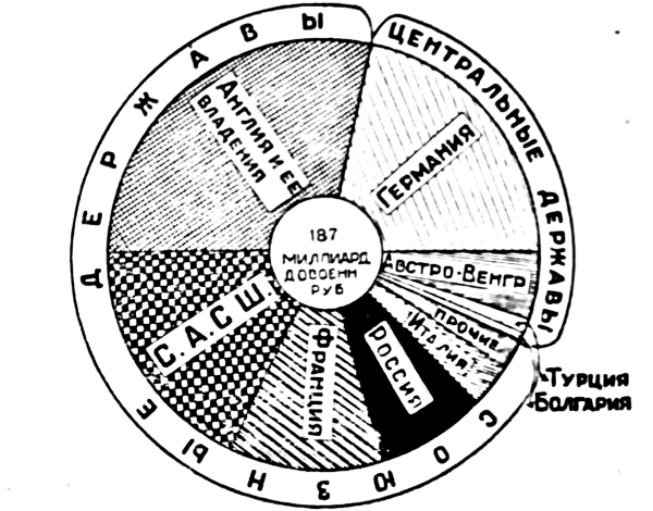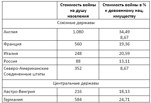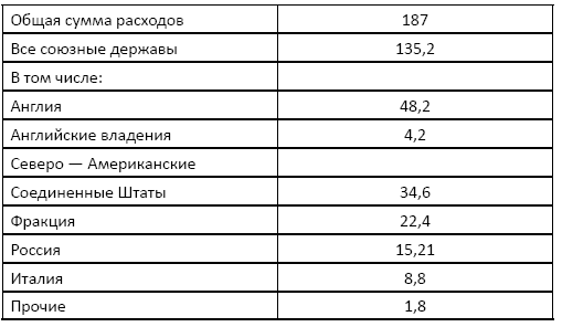 Как видно из приведенных данных, всего на долю союзных держав падает 135,2 млрд. руб. – около 73 % общей стоимости мировой войны, а на центральные державы падает 51,4 млрд. руб. – около 27 %.