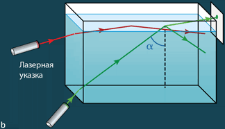 Опыт с лазерными указками демонстрирует явление полного отражения на границе между водой и воздухом. Луч, падающий на поверхность воды под небольшим углом α (зеленый), подвергается лишь частичному отражению: часть энергии покидает воду с преломленным лучом, и на экране появляется световое пятно. Скользящий луч (красный) испытывает полное внутреннее отражение