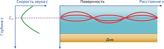 5. Пример изменения скорости звука с в океане в зависимости от глубины. В результате повышения давления и понижения температуры по мере приближения ко дну скорость достигает минимума на глубине zm, чаще всего около 1000 м