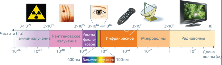 Различные области электромагнитного излучения и их применение. Узкая область между 400 и 800 нм (то есть на частотах между 800 и 400 ТГц) соответствует видимому спектру. Каждое излучение, или «спектральный цвет», обладает своей длиной волны λ, которая связана с частотой υ отношением λ = c/υ, где c – скорость света в вакууме