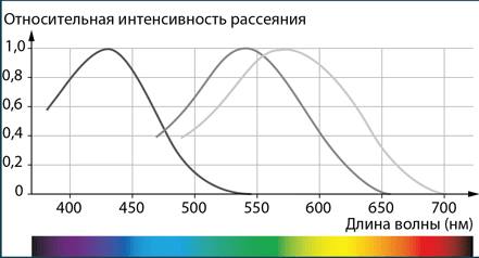 Как все это связано с цветом неба? Согласно закону Рэлея, рассеяние электромагнитных волн оказывается значительно интенсивнее для высоких частот по сравнению с низкими. Это означает, что молекулы атмосферы сильнее рассеивают синий цвет, чем красный, зеленый или желтый. Таким образом, наших глаз преимущественно достигают именно световые лучи синего цвета. Вот почему небо синее! Следуя этому рассуждению, можно было бы предположить, что небо должно быть фиолетовым, так как фиолетовое излучение обладает более высокой частотой, чем синее. В действительности в спектре солнечного излучения доля фиолетового меньше, чем синего. Кроме того, и максимальная чувствительность человеческого глаза находится в области зеленого (555 нм). В результате фиолетовая часть спектра солнечного излучения оказывается подавленной в восприятии человеческого глаза, и небо видится синим (см. главу 3, «Цветовое зрение»).