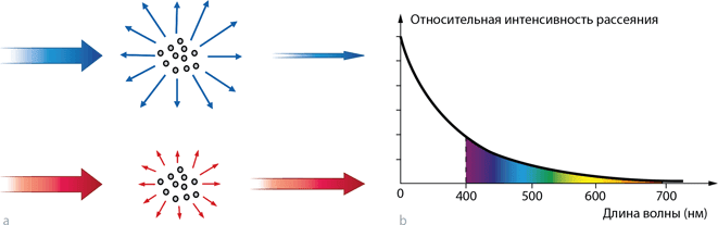 2. Рассеяние света молекулами и закон Рэлея. Под воздействием падающего монохроматического света (a) молекулы переизлучают свет той же длины волны во всех направлениях. Синему цвету соответствует длина волны около 450 нм, а красному – около 650 нм. (b) Согласно закону Рэлея, четвертая степень отношения 650/450 равна 4,3, то есть интенсивность рассеяния синего примерно в 4 раза выше, чем красного