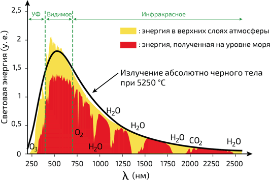 4. Световая энергия, получаемая верхними слоями атмосферы (желтый) и на уровне моря (красный) в дневное время с учетом рассеяния и поглощения. Отметки «H2O» и «O2» обозначают диапазон поглощения воды и кислорода соответственно. Энергия, отложенная по оси ординат, выражается в ваттах на кв. м поверхности, в то время как длины волн на оси абсцисс измеряются в нанометрах