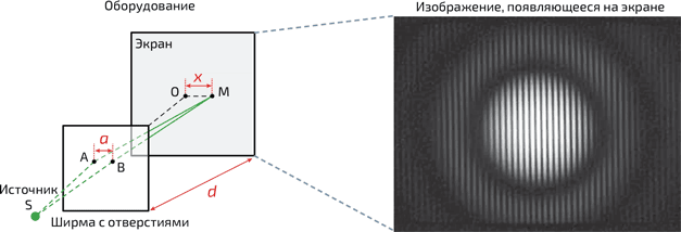 6. Опыт Юнга с интерференцией на отверстиях. Источник монохроматического света направлен на отверстия: на экране наблюдается чередование светлых и темных полос. Лучи, исходящие из A и B, интерферируют. С одним отверстием можно наблюдать размытое пятно, окруженное кольцом из-за явления дифракции