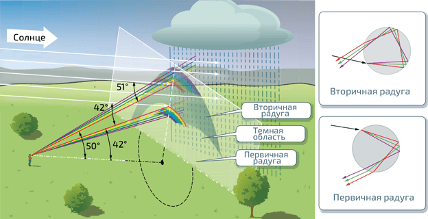 9. Путь световых лучей в основной и вторичной радугах. Средний угол отклонения – 42° и 51° соответственно. Впоследствии лучи света, составляющие основную радугу, образуют конус вращения, осью которого является прямая «Солнце – наблюдатель», а угол между ней и образующими составляет 42°