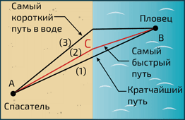 Спасатель (А), которому нужно как можно скорее спасти пловца (B), бежит по пляжу быстрее, чем плывет в море. Самый краткий путь, прямой (1), не будет самым быстрым: спасатель потеряет много времени в море. Если же он максимально сократит время плавания (3), то значительно увеличит путь по пляжу. В итоге самый быстрый путь (2), проходящий через C, – тот, который отвечает закону Снеллиуса