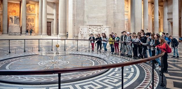1. Маятник Фуко, установленный в зале Пантеона в Париже, где в 1851 году и был поставлен опыт Фуко. Отклоненный от равновесного положения, маятник колеблется в плоскости, которая постепенно поворачивается