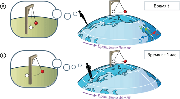 b. Спустя час Земля относительно звезд повернулась вокруг себя на восток (в направлении фиолетовой стрелки), повернулась и стойка, но плоскость колебаний маятника осталась неподвижной. В то же время для наблюдателя на Земле стойка выглядит сохранившей свое первоначальное положение, а плоскость колебаний маятника кажется повернувшейся