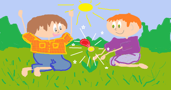 Тем временем они пришли к лесу, и на опушке заметили маленький огонек. Они побежали к нему и увидели, что это и есть тот самый волшебный цветок! Но на нем остался всего лишь один лепесток… Ребята расстроились и стали думать, как им поступить, ведь и тому и другому хотелось научиться говорить свободно и хорошо. Затем они решили сорвать лепесток и загадали: «ХОТИМ ГОВОРИТЬ ТАК ЖЕ, КАК И ВСЕ!».
