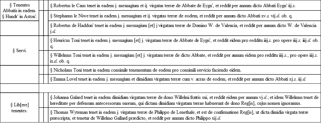 The Hundr. in Aston in the margin can hardly admit of any other extension but hundredarius or hundredarii. It seems then, that the term is applied to three tenants named first. The reason for thinking so is, that all these three are assessed at certain rents without any mention of labour services, whereas the three tenants who are next mentioned pay so much as rent and so much more in commutation of labour service, 'pro servitio.' The inference would be, that the names in the beginning apply to people burdened with suit to the hundred and to the shire, and therefore exempted in other respects. Their rents are very unequal, but in any case lower than those of the men immediately following. One very important feature admits of no dispute; the hundredors are described as servi, that is villains, in opposition to the free tenants of the Abbot of Eynsham. We know already from the text that the hundredors, if the name be applied here as in the Ely Surveys, occupied an intermediate position, and in one sense had certainly to rank with the villains, people of base tenure belonging to the townships.