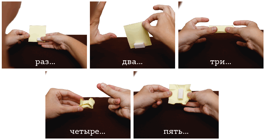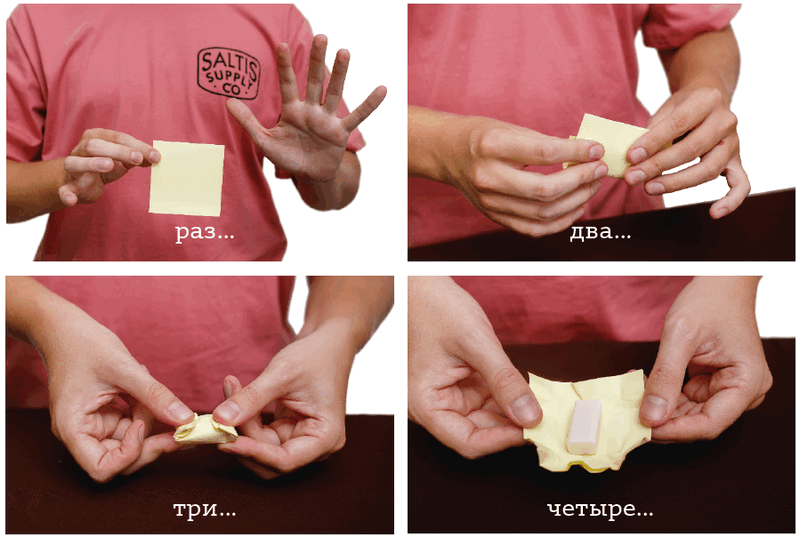 Затем ты снова показываешь стикер, но только с одной стороны, чтобы продемонстрировать «чистые руки». Далее от тебя требуется свернуть стикер несколько раз, щелкнуть пальцами, а затем «проявить» ластик внутри якобы пустого стикера.