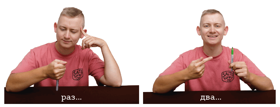 Если же человек называет зеленый цвет, не раскрывай зажатого кулака, а просто сними колпачок с маркера и покажи, что он действительно зеленого цвета, написав что‐нибудь на бумаге. При этом колпачок должен остаться у тебя в кулаке, и никто не должен о нем знать. Затем положи желтый колпачок в карман и, когда понадобится закрыть зеленый маркер, достань зеленый колпачок из того же кармана. Тебя не раскрыли, а зритель впечатлен твоим умением угадывать цвет маркера.