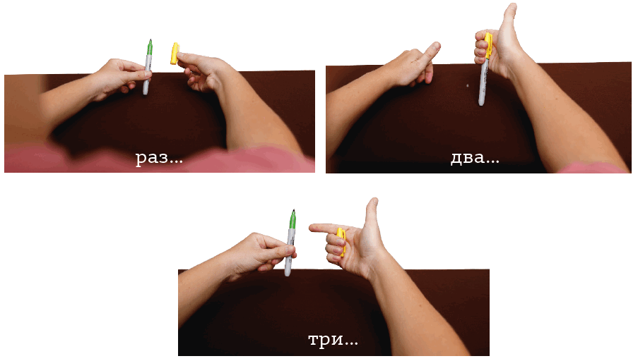 Возьми колпачок от желтого маркера и надень его на зеленый маркер. А колпачок от зеленого маркера положи в свой карман. Теперь ты готов показать фокус.