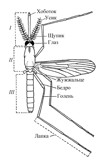 Рис. 1. Строение комара (по Гуцевич и др., 1970):