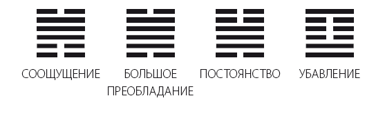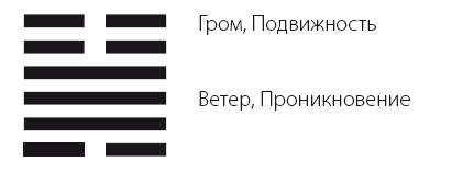 Так Водоем и Гора описывают взаимодействие чувств, а Гром и Ветер описывают длительность. Мужчина находится над женщиной, мужчина приходит к жене извне, а женщина Послушна изнутри – таково ПОСТОЯНСТВО устройства человеческого общества, поэтому и возникает ПОСТОЯНСТВО. Кроме того, твердость наверху, мягкость внизу, Гром и Ветер друг с другом соединяются, Движение Грома способно к Проникновению Ветра, твердость и мягкость друг другу созвучны – таково значение ПОСТОЯНСТВА.