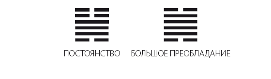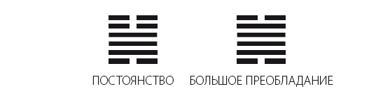 Только Двойка и Пятерка, занимающие середину верхнего и нижнего трехуровневых знаков, способны осуществить смысл ПОСТОЯНСТВА. Мягкость Пятерки на янском уровне осуществляет ПОСТОЯНСТВО, но она не способна определить, ограничить смысл деятельности, таков Путь женщины, и поэтому говорится о счастье для женщины. Твердость Двойки располагается на неподобающем положении, поэтому Двойка тоже не способна исчерпать смысл удержания ПОСТОЯНСТВА. Поэтому говорится только о том, что сожаления исчезнут, и все. На Пути ПОСТОЯНСТВА все слова и оценки даются крайне взвешенно».
