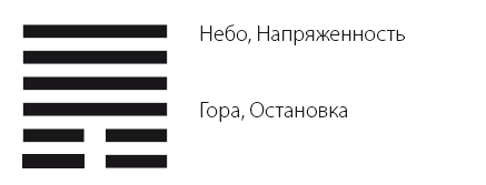 В знаке под Небом есть Гора, то есть Небо находится над вещами, такова природа ян, когда он устремляется вверх. Гора высоко вздымается над Землей, это ее облик. Но по своему действию она останавливает движение сущностей. Отсюда появляется образ подъема на холм и Остановки, невозможности продвигаться. Небо находится выше всего и покрывает все. Гора неподвижна, а Небо уходит еще выше, так появляется УХОД во взаимном противоречии. Поэтому возникает смысл убирания, отдаления. Инь рождается внизу, потом постепенно нарастает. Ян уменьшается и отступает. Маленький человек постепенно усиливается, благородный человек отступает и уходит от него, поэтому и называется «УХОД».
