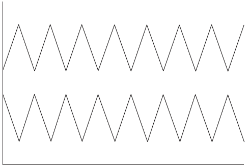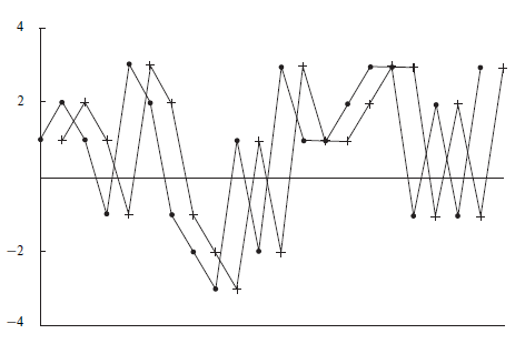Теперь посмотрите на рис. 1.3. Он показывает две последовательности, которые находятся точно в противофазе. Когда одна линия идет вверх, другая следует вниз (и наоборот). Мы называем это отрицательной корреляцией.
