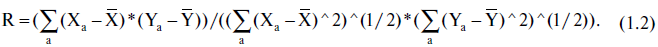 Формула для коэффициента линейной корреляции r двух последовательностей Х и Y такова (черта над переменной обозначает среднее арифметическое значение):