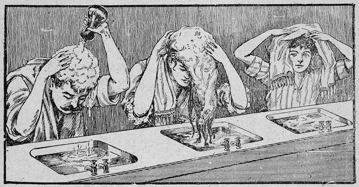 Преимущество сухого мытья шампунем, будь то с помощью опасной жидкости или безвредного порошка, заключалось в том, что для него не требовалась вода – ценный ресурс, которым большинство британских домов не располагало в достаточном количестве (что и говорить о горячей воде) вплоть до второй половины XX века (как, впрочем, и ванными комнатами). Поэтому, пытаясь установить частоту мытья волос, важно помнить, что эта практика сильно зависела от классовой принадлежности, культурных норм и доступа к воде. Об этом наглядно свидетельствует рекламная брошюра, сопровождавшая шампунь марки Harlene’s Cremex, продукт эдвардианской эпохи, продававшийся в саше, по шесть штук в упаковке за шиллинг. Вспениваемый с водой, Cremex, согласно рекламе, был разработан специально для домашнего использования. На иллюстрации изображены мужчина, женщина и подросток на разных этапах мытья шампунем, каждый склонился над раковиной с кранами горячей и холодной воды (ил. 1.17). Текст поясняет: