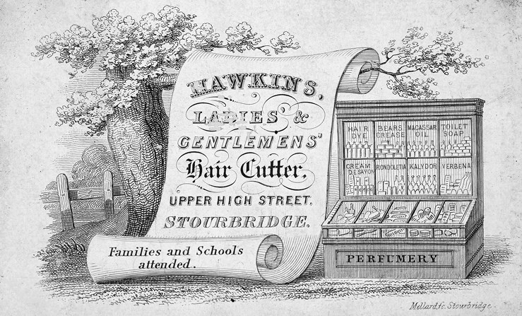 Ил. 2.2. Визитная карточка парикмахера начала XIX века. Парикмахер совершает визиты на дом, предлагая свои услуги дамам и господам, семьям и школам. На витрине справа демонстрируются товары, которые можно у него приобрести, в том числе расчески и щетки, а также такие продукты, как краска для волос, масло макассара, медвежий жир и мыло