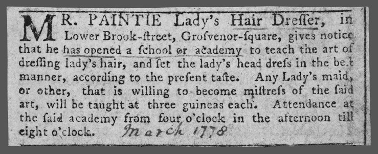 Ил. 2.3. Pекламное объявление из газеты 1778 года от некоего мистера Пейнти, дамского парикмахера, открывшего собственную академию для обучения искусству женских причесок