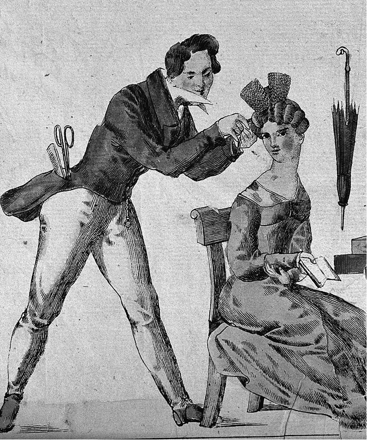 Ил. 2.4. Парикмахер-мужчина делает прическу женщине. Цветная гравюра начала XIX века. Гребень и ножницы, его профессиональные инструменты, находятся под рукой в кармане его фрака. Высоко поднятый воротничок его накрахмаленной рубашки, печать на цепочке у пояса и облегающие панталоны, закрепленные штрипками, говорят о том, что он следует последним модным веяниям