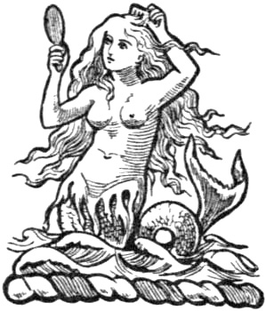 The mermaid is represented as the upper half of a beautiful maiden joined to the lower half of a fish, and usually holding a comb in the right hand and a mirror in the left; these articles of the toilet have reference to the old fable that always when observed by man mermaids are found to be resting upon the waves, combing out their long yellow hair, while admiring themselves in the glass: they are also accredited with wondrous vocal powers, to hear which was death to the listener. It was long believed such creatures really did exist, and had from time to time been seen and spoken with; many, we are told, have fatally listened to “the mermaid’s charmèd speech,” and have blindly followed the beguiling, deluding creature to her haunts beneath the wave, as did Sidratta, who, falling in the Ganges, became enamoured of one of these beautiful beings, the Upsaras, the swan-maidens of the Vedas.