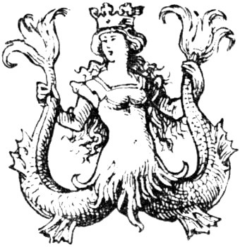 The arms of the princely house of Lusignan, kings of Cyprus and Jerusalem, “Une sirène dans une cuvé,” were founded on a curious mediæval legend of a mermaid or siren, termed Mélusine, a fairy, condemned by some spell to become on one day of the week only, half woman, half serpent. The Knight Roimoudin de Forez, meeting her in the forest by chance, became enamoured and married her, and she became the mother of several children, but she carefully avoided seeing her husband on the day of her change; one day, however, his curiosity led him to watch her, which led to the spell being broken, and the soul with which by her union with a Christian she hoped to have been endowed, was lost to her for ever.