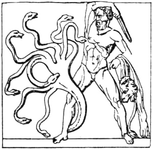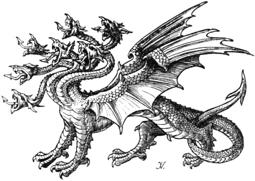The terrible dragon, with one hundred heads, that guarded the golden apples of the Hesperides, slain by Hercules, was celebrated in classic mythology; so was the Lernean hydra, a monster of the marshes that ravaged the country of Lerna in Argolis, destroying both men and beasts. The number of its heads varies with the poets, though ancient gems usually represent it with seven or nine. Hercules was sent to kill it as one of his twelve labours. After driving the monster from its lair with arrows he attacked it with his sword, and in place of each head he struck off two sprang up. Setting fire to a neighbouring wood with the firebrands he seared the throat of the Hydra until he at length succeeded in slaying it. The fable is usually referred to in illustration of a difficulty which goes on increasing as it is combated. (See page 63.)