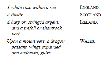 “A monstrous wyld and cruelle beasteCalled ye dun cow of Dunsmore Heath.”The dun cow is still one of the badges of the Guards. This monarch founded the office of Rouge dragon pursuivant on the day before his coronation (October 29, 1485). Henry VII., Henry VIII., Edward V., Mary and Elizabeth all carried the dragon as a supporter to the royal arms, but varied in position, and at times superseded by a greyhound. (A greyhound argent, collared or, the collar charged with a rose gules, was a Lancastrian badge.) Henry VIII. used for supporters the red dragon and white greyhound of his family; a red dragon and a lion gardant gold, sometimes crowned; at other times a silver greyhound and a golden lion, an antelope, a white bull, a cock, &c. On the union of Scotland and England under King James, the Scottish unicorn was substituted for the sinister supporter, while the lion gardant, first adopted by Henry VIII., appears to have permanently superseded the red dragon of Wales, the white greyhound, &c., as the other supporter of the royal arms, the dragon being relegated to be the special badge of the principality of Wales, which position it still retains. The present royal badges, as settled at the union, 1801, are: