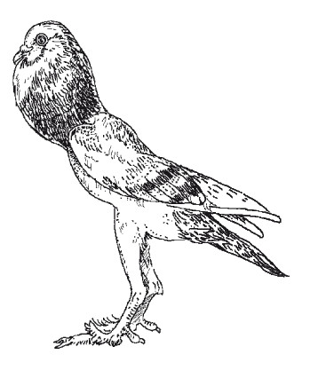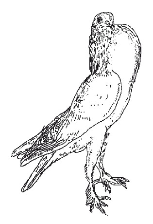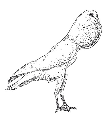 Особое внимание голубеводы уделяют фигуре в целом, зобу, который должен быть шарообразным и подвязанным внизу, и длинным ногам. Длина ног зависит от того, насколько выпрямлена фигура. При правильной стойке она должна достигать 170–180 мм, считая от верхней части бедра до конца пальцев. Бедро поставлено вертикально. Контурная линия его передней части не должна быть очень выпуклой. Ноги покрыты короткими перьями (откосы считаются дефектом). Нижняя часть ноги покрыта узкими перьями длиной 30–50 мм, образующими тарелку. Крылья длинные, узкие, прижаты к телу. Хвост сложен из широких рулевых перьев, длина его пропорциональна длине туловища; хорошо собран. Он не должен касаться земли.