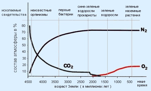 На рубеже в три миллиарда лет назад первоначальная форма жизни, выработав свой ресурс в воздушной среде, постепенно перебирается в новую стихию – водную, где, получив возможность для безграничного перевоплощения, расцвела пышным разнообразием различных видов. Но перед появлением первых по-настоящему сложноорганизованных биологических форм жизни, зародившихся только в последние 500 миллионов лет, еще миллиарды лет на Земле владычествовали примитивные бактерии, сине-зеленые водоросли, а впоследствии просто зеленые водоросли, которые перерабатывали остатки углекислого газа в кислород. Снижение углекислого газа способствовало еще большему снижению парникового эффекта, что, в свою очередь, привело к нормализации температуры и появлению благоприятных условий для выхода жизни на сушу.