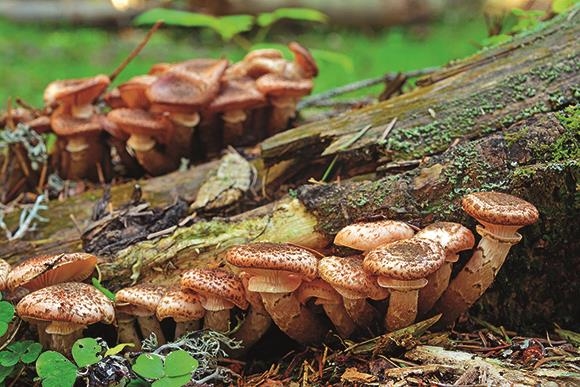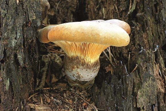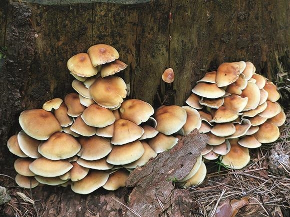 Среди любителей мертвой смолистой сосновой древесины, как сухой, так и гнилой, съедобных грибов не так уж много. На гнилых пнях охотно поселяются ложноопенок серопластинчатый и ложноежовик студенистый; на гниющей, часто прикрытой землей древесине – строчок осенний; на корнях и у основания пней и стволов – свинушка толстая, рядовка желто-красная и плютей чернокрайний, на живой древесине – осенний опенок темный.