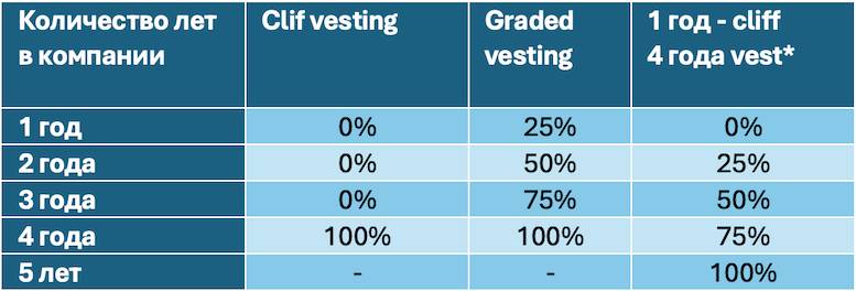 Таблица 1.Типы vesting (вестинга). Вестинг бывает двух типов Cliff (утёс) или Graded (поэтапный). В таблице приведены проценты от вознаграждения в зависимости от количества лет, проведенных в компании после заключения сделки.