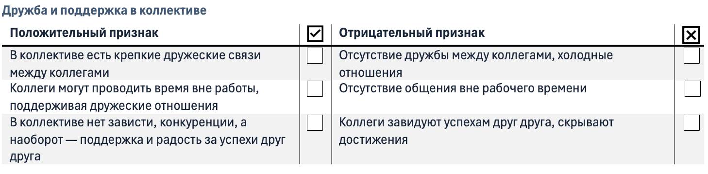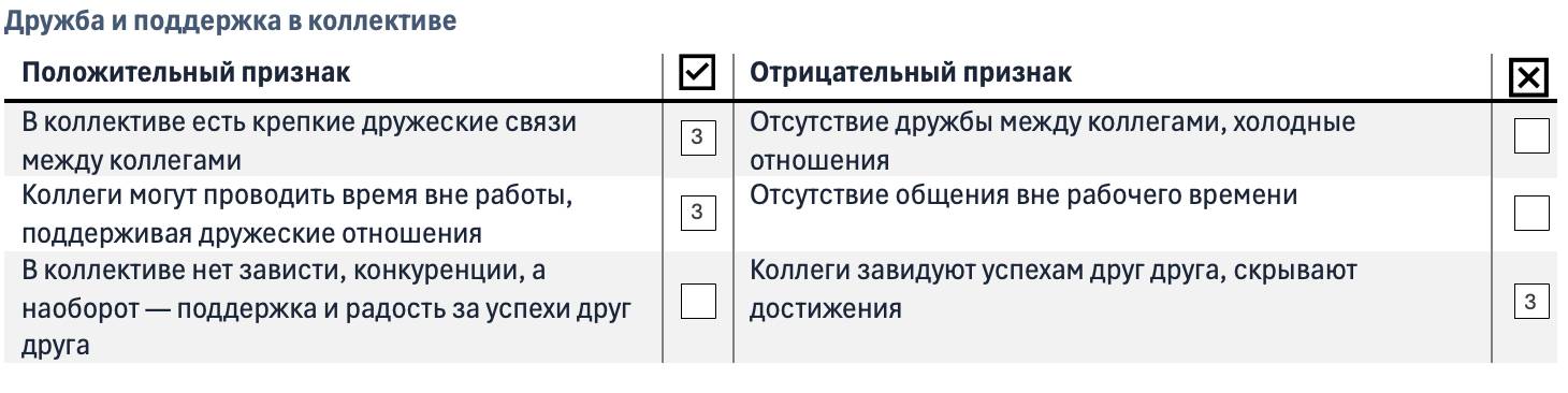 Пример: если ты выбрала командную работу, дружбуи руководителяв таблице 1, то для признаков из этого списка, например, для дружбы, ты проставляешь 3 балла для каждого признака.