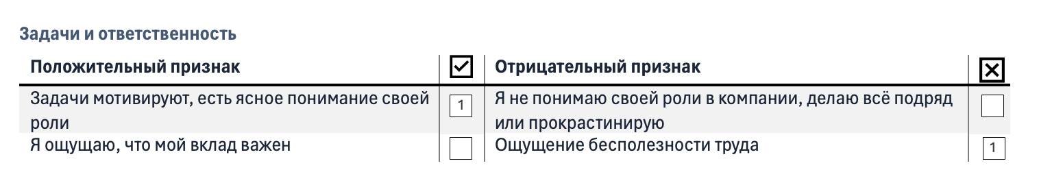 А для всех остальных областей, например, для задач и ответственности, ты проставляешь 1 балл: