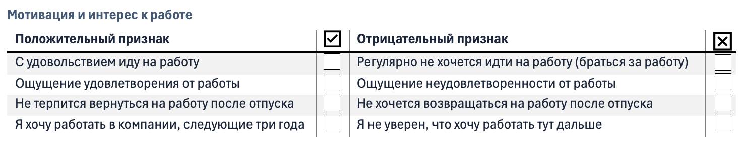 Хорошо, если ты уже знаешь свой предел и уровень неудовлетворенности от работы. Но чтобы ты могла оценить это системно, я подготовил следующее упражнение на основе ключевых метрик, влияющих на мотивацию и вовлечённость.