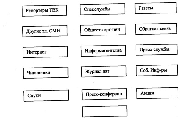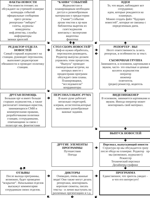 Однако, в большинстве случаев, вечно спешащие куда-то журналисты не успевают остановиться и задуматься над тем или иным фактом, взглянуть на него с другой стороны. Львиная доля репортеров, едва получив задание от редактора, несется, сломя голову, его выполнять. И после того, как конкуренты выдают сногсшибательный материал на эту же самую тему, в редакциях начинают звучать оправдания по поводу «замыленого» взгляда и бешеного ритма работы. Такое случается довольно часто. Событие не очень приятное, но все же поучительное, поскольку заставляет журналистов внимательно обращаться с различными источниками информации, стараться использовать всевозможные пути добычи фактов. Сейчас любое средство массовой информации напоминает своеобразный «конвейер новостей», который на телевидении, к примеру может выглядеть так: