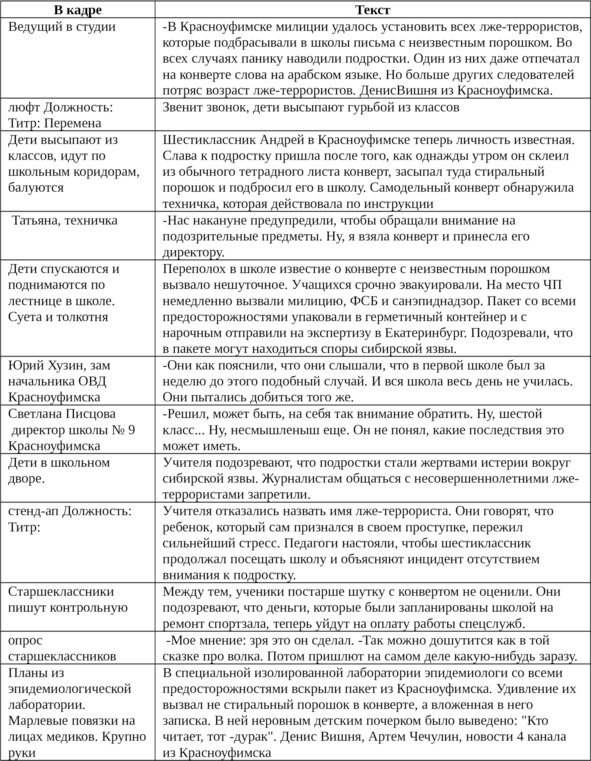 – «Нюх» на новости – журналистское чутье. Зимой 2002 года количество звонков лжетеррористов в школы превысило все разумные пределы. Сообщения о заложенных в кабинетах учителей пакетов с «сибирской язвой» приобрело нездоровый характер. Репортеры договорились между собой, не публиковать информацию об анонимных звонках. Но табу это было нарушено, когда стало известно об обнаружении одного из юных «террористов». Корреспонденты екатеринбургской телекомпании «Четвертый канал» первыми оказались на месте событий. И вот какой репортаж получился: