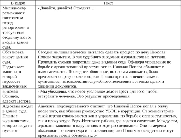 – Агрессивность. Агрессивность журналистам необходима. Иногда полезно «показать зубы», чтобы добиться оптимального результата. При этом агрессивность журналиста, как правило, обратная реакция на агрессию со стороны власть предержащих. Весной 2001 года к нам редакцию обратились адвокаты сотрудника управления по борьбе с организованной преступностью Николая Попова. Они требовали изменения своему подзащитному меры пресечения. Попова обвиняли в вымогательстве, но адвокаты настаивали на политической подоплеке. По их мнению, Попова держали под арестом за критику руководства управления по борьбе с организованной преступностью. Давление, которое оказывали на адвокатов и журналистов было настолько мощным, что репортерам даже пригрозили использовать против них оружие, если они попробуют заснять выходящего из суда Попова. Вот лишь начало сюжета, которое прошло по ТВ: