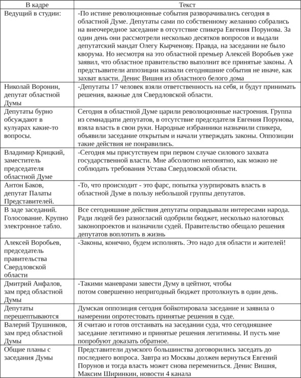 – Дипломатичность. Попыток свержения председателей региональной думы в Свердловской области было три. Различные политические группы пытались инициировать отставку спикера ради решения совершенно других, порой достаточно узких вопросов. Журналисты даже окрестили подобные попытки свержения власти «спикергейтом». Депутаты оппоненты всегда умело (и не без помощи политтехнологов!) держали общественность в напряжении, каждый раз давая повод к пересудам, «подкручивая» накал страстей. Итогом второй попытки отправить спикера областной Думы в отставку увенчались победой оппозиции. И задача журналистов, которые устали к тому времени от всех этих передряг и дебатов – объективно рассказать о происшедшем. В приведенном ниже тексте заметно, что интервью превалируют над текстом репортера. Что позволило журналистам остаться над «схваткой», конфликтом и представить мнение всех сторон, оставив при себе личные впечатления.