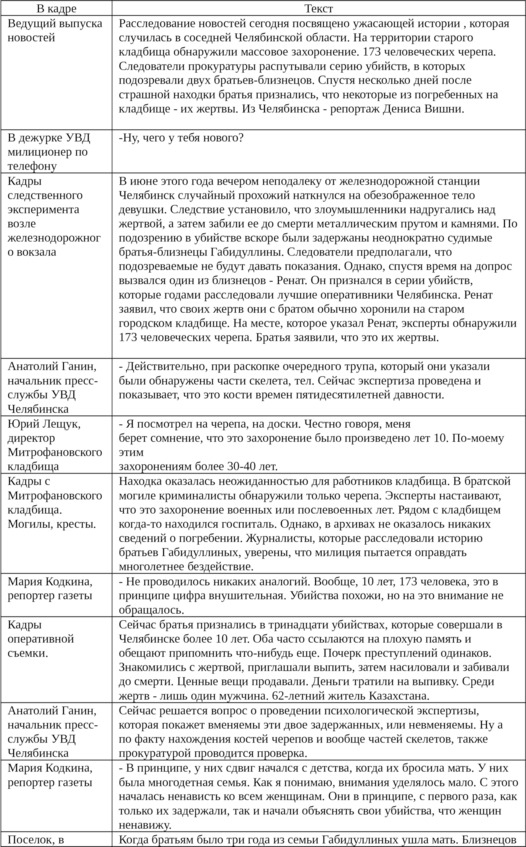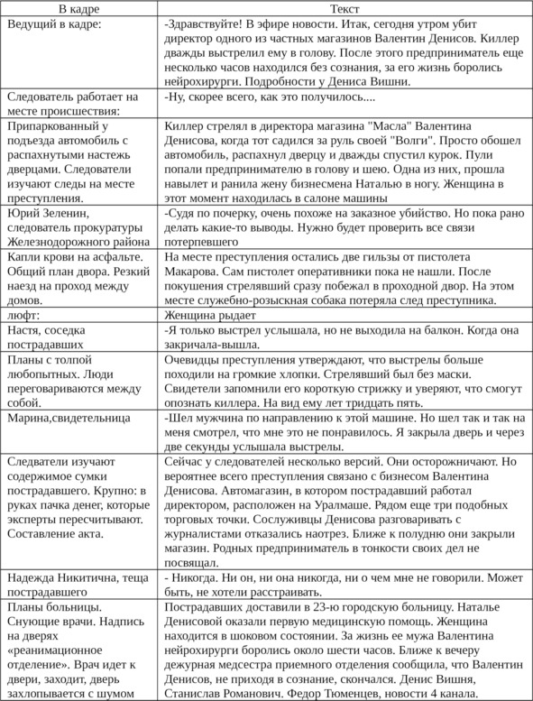 – Чувство времени. Время, пожалуй, самый ограниченный ресурс в работе журналиста. В кратчайшие сроки нужно не только успеть собрать информацию, обработать ее, но и опубликовать. При этом, на телевидении и радио существует еще одно ограничение – формат сюжета, истории должен укладываться в определенные редактором и продюсером временные рамки. В среднем на съемку одного сюжета в теленовостях региональных станций отводится около двух часов, включая дорогу с учетом пробок, ожидание на месте события и т. п. Однако, практика показывает, что и этого времени может не хватить, и в таком случае вам понадобится помощь коллег. Иногда проще использовать две съемочные группы, одна из которых будет работать непосредственно на месте события, а вторая помогать ей отыскать второстепенных участников истории, узнать дополнительно мнение людей причастных к конфликту. Таким образом, одна телевизионная бригада выполняет функции исследователей, аналитиков и работает в эпицентре события, а вторая – обретает мобильность и находится, что называется «на подхвате». Ниже приводится текст сюжета о заказном убийстве бизнесмена, который вряд ли бы претендовал на полноту изложения, если бы не помощь коллег. Они помогли нам уточнить детали и сделали часть съемок, на которые у нас просто времени не хватило бы.