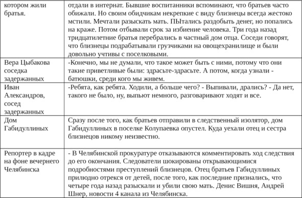 – Вдумчивость. История о братьях-убийцах в Челябинске наделала немало шума в 2000 году. Новость о маньяках, которые признались в массовых убийствах обсуждалась в каждом доме, признания братьев не давали покоя следователям, а все факты обрастали все более невероятными слухами. Репортеры просто сопоставили цифры вероятных жертв убийц с их возрастом. И пришли к выводу, что к части обнаруженных человеческих останков братья не имеют никакого отношения. Для проведения собственного расследования решено было ехать в Челябинск, где журналисты продолжали упрекать милицию в бездействии и укрывательстве преступлений. Это расследование вышло в эфир телекомпании «Четвертый канал» 21 ноября 2000 года: