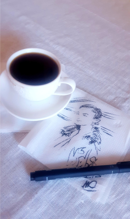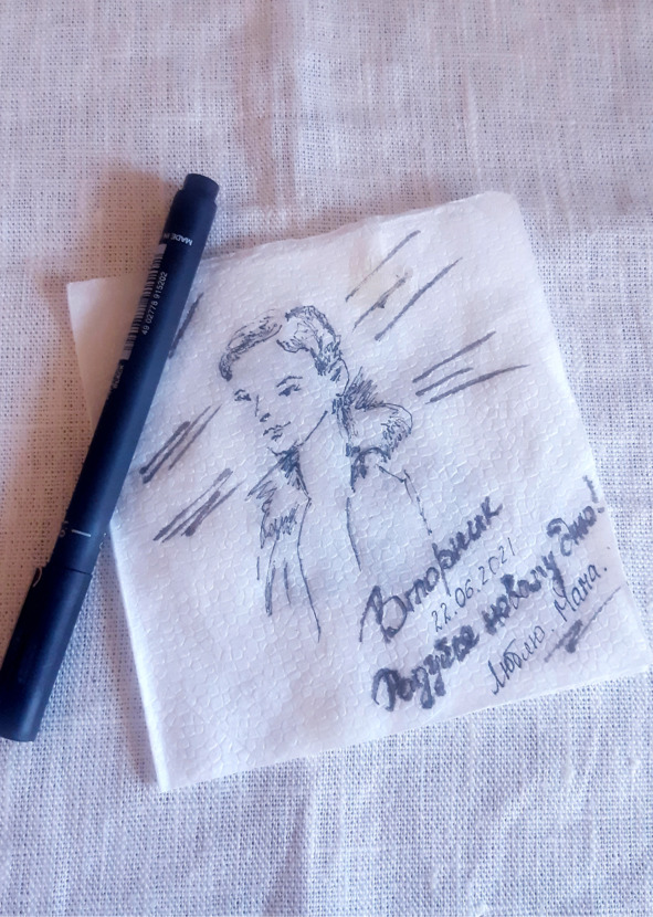 Вишнёва Екатерина22.06.2021Всё началось 28.01.2015. Я тогда работала в Москве официанткой во вьетнамском кафе на улице Газетной, которая совсем рядом с красной площадью. И вот сижу я в Макдоналдсе с чашечкой горячего капучино, жду, когда откроется вьет-кафе, улыбаюсь и думаю о вас мои девочки. Подходит мужчина, и протягивает мне салфетку, на которой был запечатлён мой образ. А вообще, то, что меня рисуют, повелось ещё с детства (однажды в санатории «Надежда» мой портрет написал художник, слышала, что он до сих пор там висит).