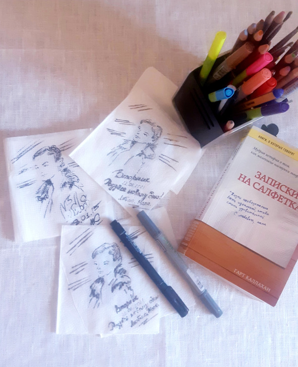 И вот родилась идея рисовать вам на салфетках. А ещё в придачу я как раз читаю книгу, которая называется «Записки на салфетках».
