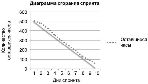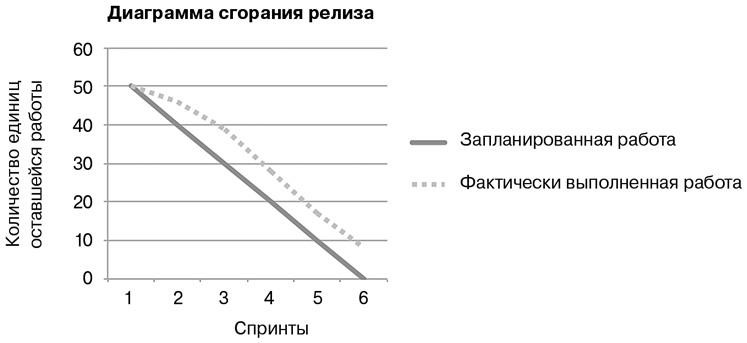 Диаграмма сгорания очень важна – ведь дата окончания спринта устанавливается раз и навсегда. Наряду с ежедневными скрам-митингами бэклог спринта и диаграмма сгорания наглядно показывают команде, когда она сбивается с ритма, и позволяют предметно обсудить, что можно предпринять для исправления ситуации. Диаграмма сгорания спринта «сжигает» часы работы по дням спринта, тогда как диаграмма сгорания релиза отражает выполнение единиц работы (часто оцениваемых в неких условных единицах) или количество спринтов, оставшихся до релиза. В главе 3 и 5 подробно рассказывается про бэклоги и диаграммы сгорания.