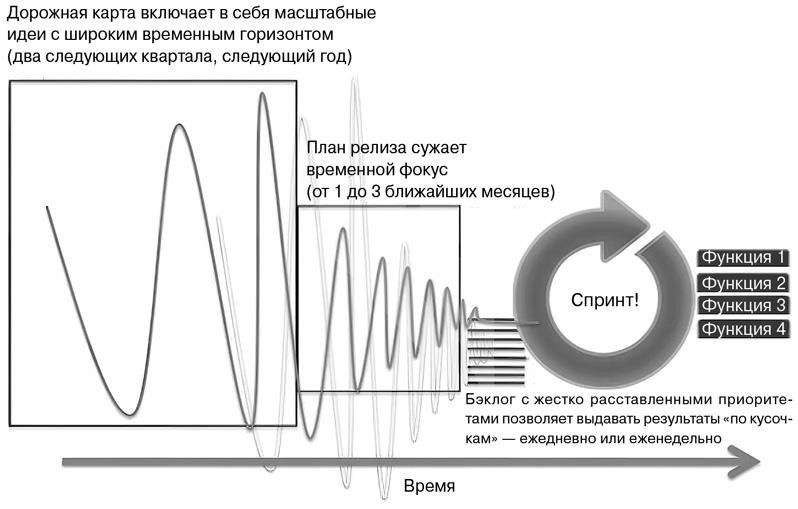 Как уже говорилось в первой главе, скрам – новое воплощение цикла Деминга: планируй – пробуй – проверяй – корректируй. (Постирай. Прополощи. Повтори.) Причины этого ясны как день: в ходе жизненного цикла проекта у вас появляются новые знания относительно требований и технологий. Поэтому степень детализации планирования лучше ограничивать проработкой сроков проекта и его результатов. Иными словами, долгосрочное планирование сводится к слишком грубым прикидкам (если говорить о качестве оценки), а планы на ближайшую перспективу обычно гораздо более детализированные. Нижеприведенная схема иллюстрирует идею сужения фокуса с точки зрения временного горизонта. Дорожные карты, которые мы рассмотрим в главе 6, дают широчайшие возможности: у них долгосрочный диапазон (иногда это годы). Планы релизов продукта позволяют заглянуть в будущее, на срок от одного до трех месяцев (иногда чуть дальше), а их возможности не такие широкие: грубо говоря, планы релизов скорее указывают на то, чего команде не стоит делать, чем на то, что нужно попытаться сделать. И, наконец, план спринта – это узкий спектр задач: команда берет на себя обязательство по выполнению определенного объема работы в относительно короткой срок (цикл из 1–4 недель; подробнее см. главу 3).